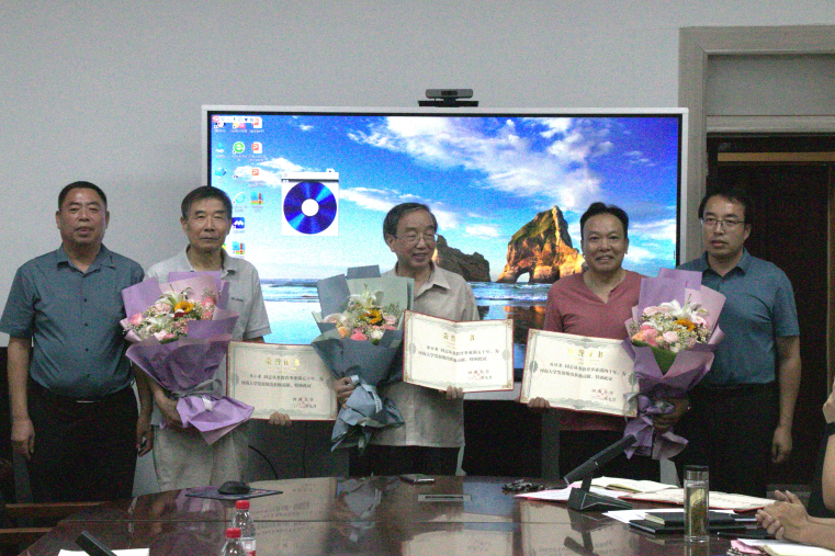会议对新增从教满30年以上教职工进行表彰,张占党和院长祁琛云为从教满50年的马小泉老师、涂白奎老师,从教满40年的刘信亮老师颁发证书并献上鲜花。