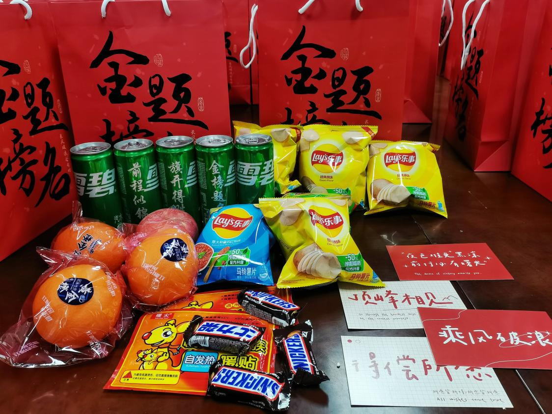 考研福袋上题有“金榜题名”“长风破浪会有时”书法字样,祝愿同学们在考研中取得优异成绩。福袋内的定制版雪碧上注有“前程似锦”“旗开得胜”等美好寄语,希望同学们“雪”以致用、“碧”操胜券;苹果和橙子寓意着考研学子们“苹”安赴考、“橙”功上岸;薯片象征着非你莫“薯”;士力架预示着同学们“士”气如虹;暖贴给寒冬紧张备考的同学们送去温暖和力量;所有福袋中还有免费性爱影片