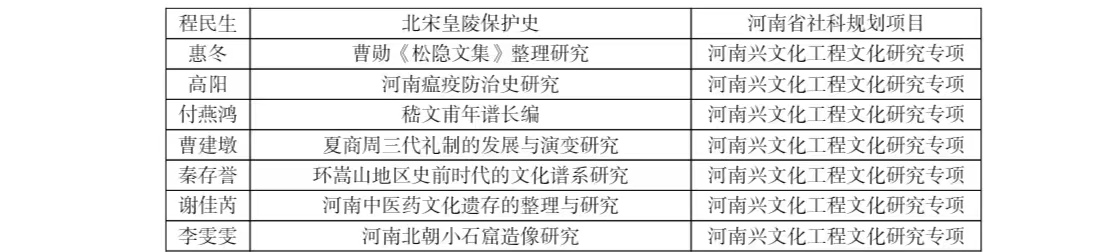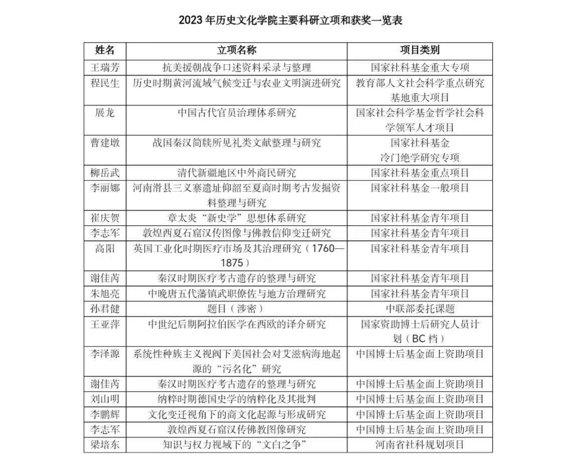 在科研立项和成果获奖方面成绩喜人。全年共获批省级以上科研项目33项。获批国家社科基金项目10项,立项数全校第一,其中重大项目1项,重点项目3项,一般项目1项,青年项目5项,涵盖中国史、世界史、考古学、宗教学等4个学科;教育部人文社科重大项目1项,中国博士后基金面上资助项目和国家资助博士后人员BC计划项目6项,河南省社科规划项目2项,河南省兴文化工程专项7项。免费性爱影片