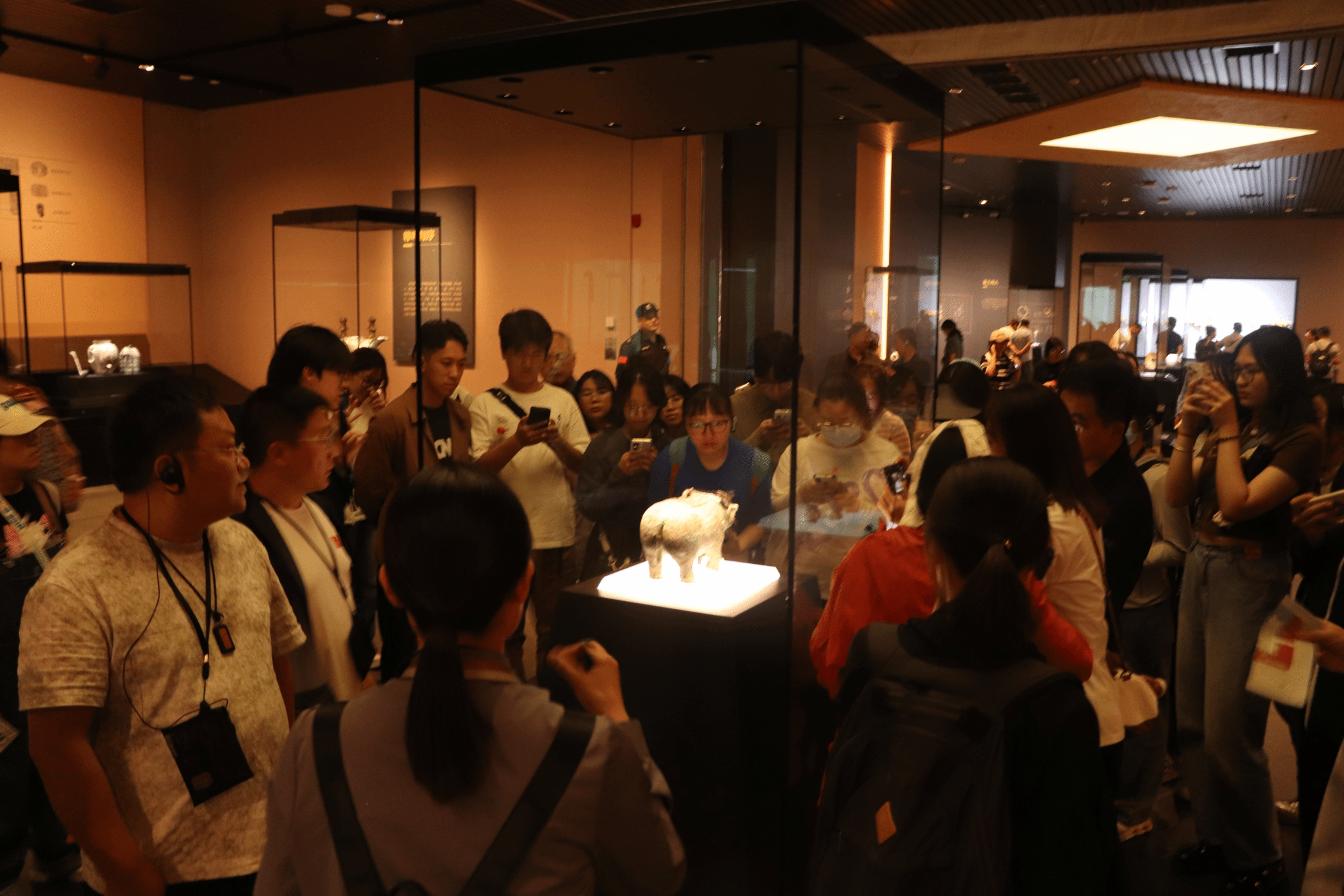 安阳的殷墟作为商朝后期都城遗址,出土了大量以青铜器为代表的文化遗存。其中,亚长牛尊是现今为止,殷墟发现的唯一一件牛形青铜器,也是安阳殷墟博物馆的镇馆之宝。展厅内,同学们有幸一睹真容,不禁与《国家宝藏》中亚长牛尊的国宝守护人吴樾一样,发出“我现在才明白为什么那个时候被称为青铜时代”的感慨。牛尊体态健壮,牛头前伸,口部微张,其眼、耳、鼻、角、腹、尾以及其他体貌特征均生动逼真。牛身满饰龙、鸟、虎、象等各种动物形纹饰。造型奇特瑰丽,纹饰繁缛精美。据安阳殷墟博物馆的专家介绍,尊是酒器的一类,亚是武官的称谓,长是家族长氏的意思。这件通体遍饰神性动物纹样的牛尊,不仅仅是一件祭礼的酒器,更是殷商时期人神沟通的媒介,担负着沟通天地的神圣职责。