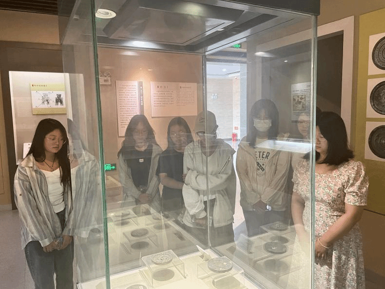 文物与博物馆学专业学生在任课老师曹金萍带领下在文物馆开展实践教学。首先,看实物感历史,依托文物馆陈列的文物直观概括中国古代物质文化发展史的脉络、实物展示各个时期物质文化的典型特征、货币实证中华文明的突出特性,让学生在认知文物的同时宏观地感知历史、增强民族自信;其次,观展览提问题,结合《中国古代钱币》课堂内容重点围绕文物馆古代钱币展厅的基本陈列内容进行点评,引导学生针对陈列展览设计、展品摆放、展陈方式以及讲解内容设计和参观路线导引规划等多方面提出问题并展开讨论。文物馆实践课堂内容环环相扣,过程积极互动,使学生真正成为课程的主导者,实现教学主体的多样性与互补性相结合,活化书本理论知识,以实践感知促理论吸收、以理论知识提高实践质量。