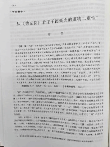 教师徐莹教授在《哲学研究》2024年第6期发表《从〈德充符〉看庄子德概念的道物二重性》一文,文章认为:“德”的早期含义与天命密切相关,且最初得自帝和天。庄子之“德”,也位于先秦天命思想的发展路径上。它首先是一个表示道的概念,主要内涵是内在于万物的道。“内在于万物的道”使庄子之“德”具有道物二重性:道性是指万物之德共同具有的道的属性,此为德的同一性;物性是指“万物各有其德”中德的个体属性,此为德的分别性。对人而言,德即人之为人的内在规定和本质特征。这种本质特征,从道的角度讲,是德;从人和万物的角度讲,是性。德不是道与性的中介,德和性是一体两面的关系。《德充符》中塑造了诸多形残德全、形全德残的形象,表达着德形的对立。但德与形同出于道,二者同根同源,原本并不对立。德形之争是道性与物性的冲突,是人成为人之后,由于对名、利、智、识等人为之物的过度使用和追求,使天然的内在生命遭到戕害而导致的一种人为对立。解除此“天刑”之桎梏的方法是“吾丧我”。离形去智之后,被外物、被人为遮蔽的天德彰显并充实起来,人类用这种“内在于自身的道”,便可与天地万物、与大道融为一体。而形残德全者具有的那些神奇能力,是道的力量。孔子在该篇的反复出现,更加凸显出德的道物二重性特征。