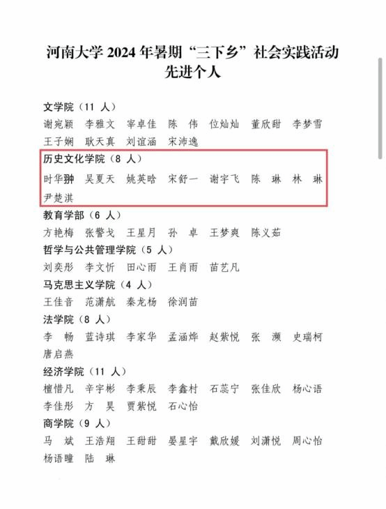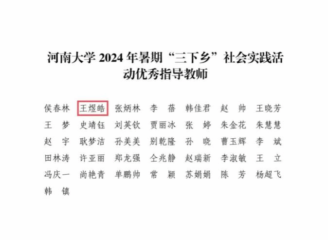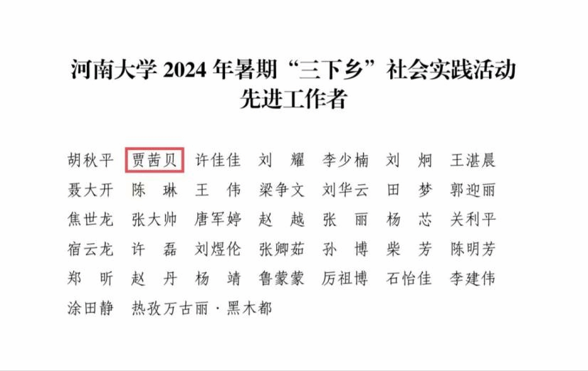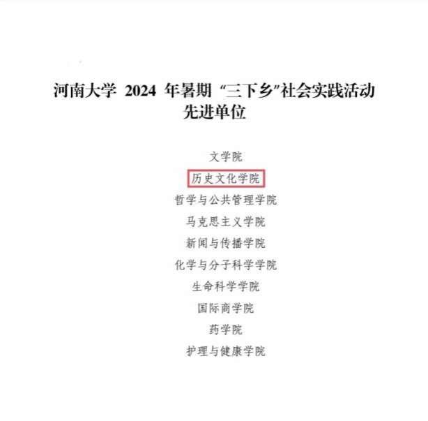 荣获“暑期‘三下乡’社会实践活动先进单位”;贾茜贝被评为社会实践活动“先进工作者”;王煜皓被评为社会实践活动“优秀指导教师”;时华翀等8名同学获社会实践活动“先进个人”荣誉称号。
