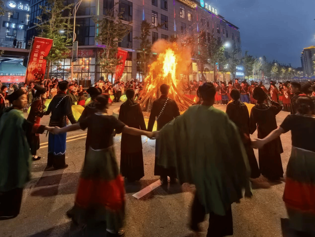 (汉彝同心团队与彝族人民共跳达体舞庆祝火把节)