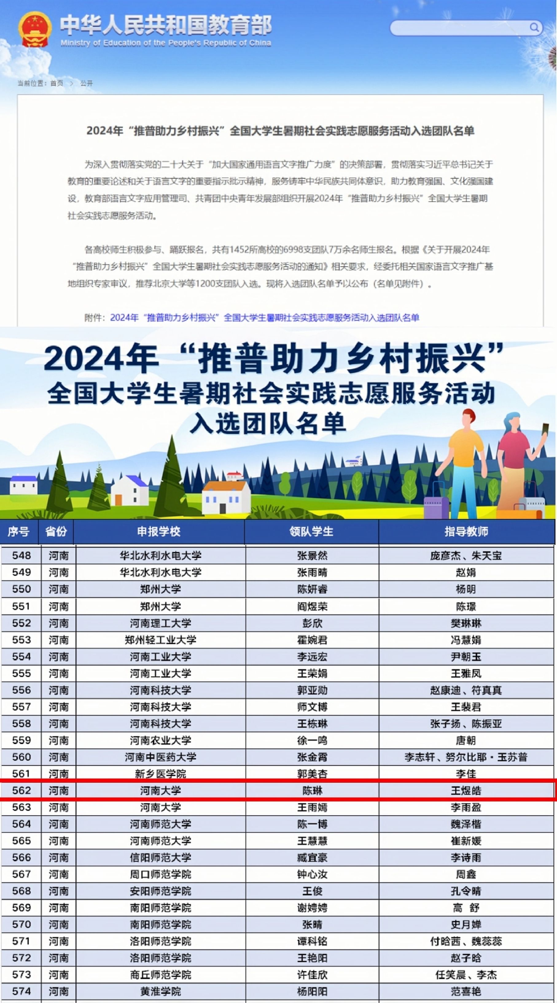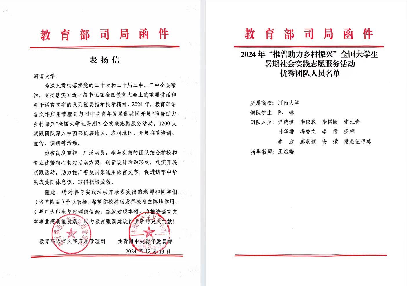“汉彝同心”实践团队在2024年“推普助力乡村振兴”全国大学生暑期社会实践志愿服务中的优秀表现通报表扬,本次专项活动吸引了全国1452所高校的6998支团队7万余名师生报名,主办方从中遴选了1200支团队立项,最终约有240支团队获得教育部和团中央联合发信表扬。