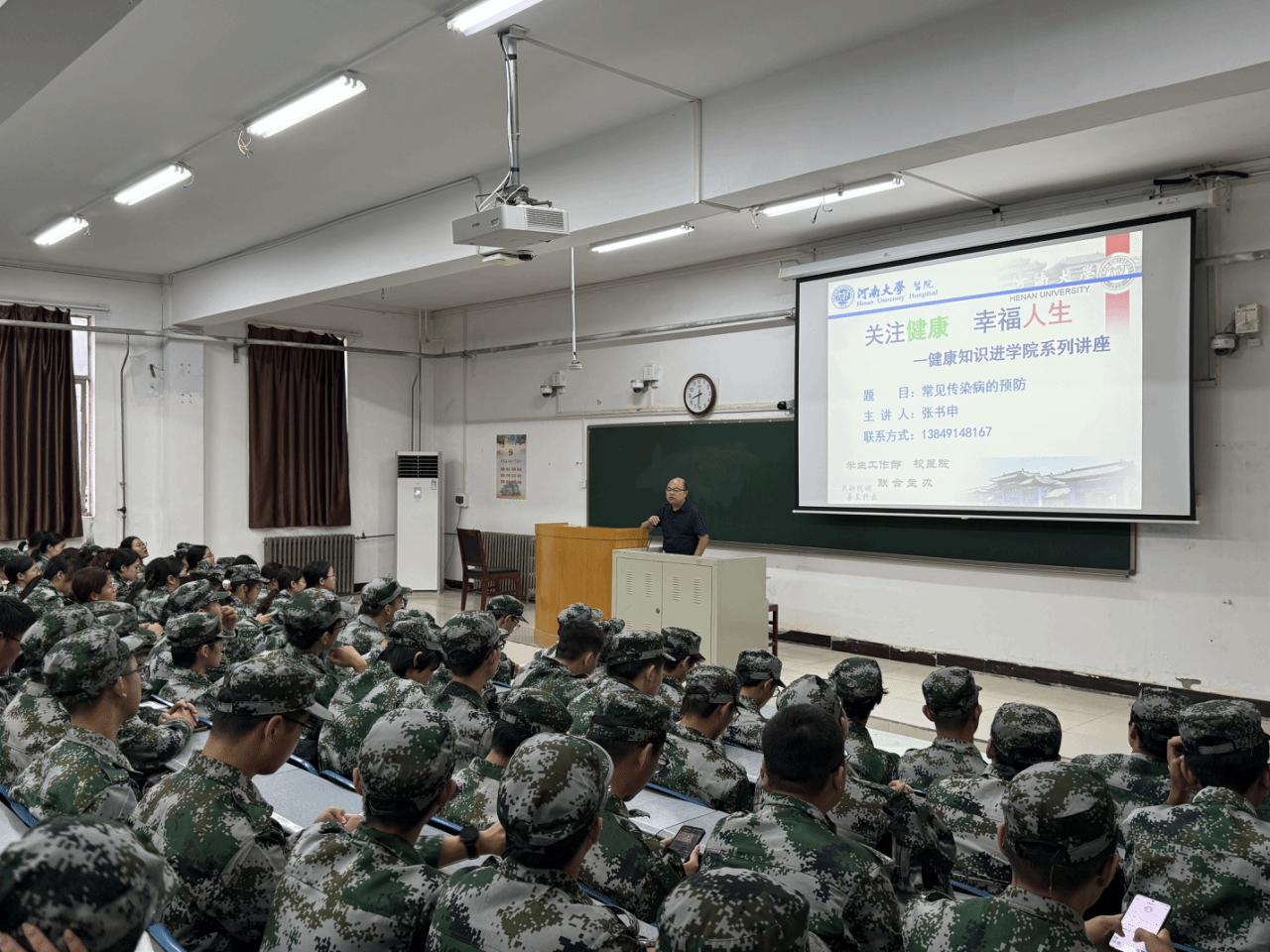 特邀校医院副院长张书申为新生开展卫生健康专题讲座。他从大学生日常生活实际出发,讲解健康防护基本知识,列举了大学生常见的不良生活方式及危害,重点介绍了常见传染性疾病的科学预防措施,鼓励同学们牢固树立健康第一的理念,自觉养成有益身心的行为习惯。