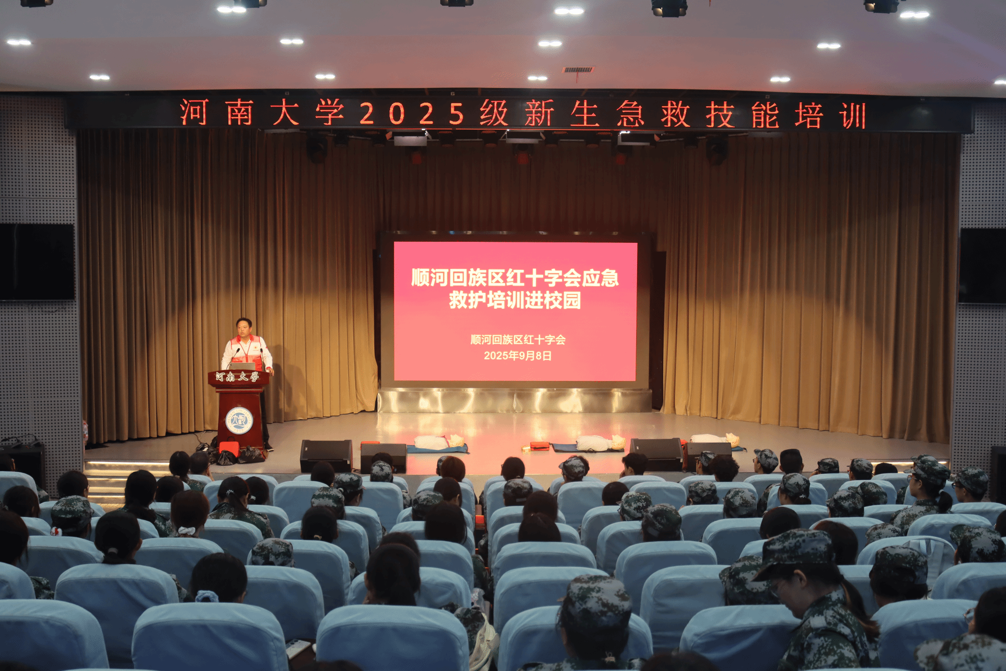 邀请顺河回族区红十字会成员为2025级新生开展应急救护培训。红十字会成员系统讲解和演示海姆立克急救法、胸外按压、人工呼吸、AED使用及创伤包扎等核心急救知识与操作要点。通过分步示范和情景模拟,帮助在场参与者深入理解急救原理、掌握操作规范。培训结束后,组织学生进行胸外按压、海姆立克急救法等实操演示,纠正不规范操作。此类实用技能不仅增强了学生自身应对突发状况的能力,更提升了救助他人、奉献社会的责任意识。