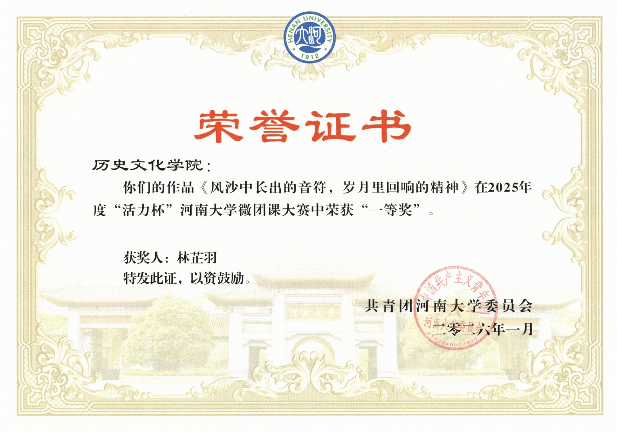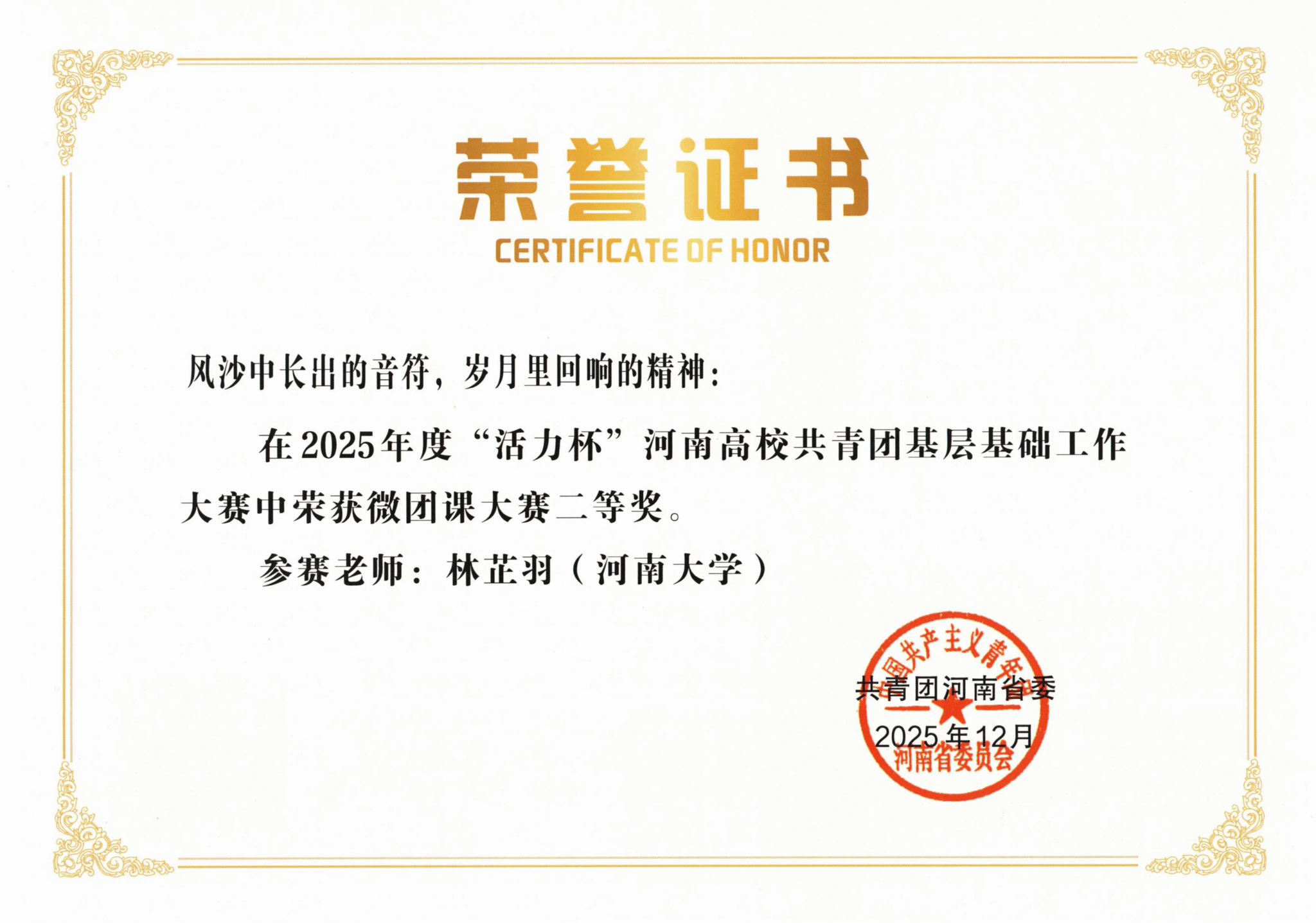在微团课比赛中,林芷羽的作品《风沙中长出的音符,岁月里回响的精神》以思想深刻、形式新颖的讲述方式,在校级评比中荣获一等奖,并被推荐参加省级评选,最终斩获河南省二等奖。该作品以兰考泡桐木制成的古筝为切入点,深入挖掘其背后所蕴含的焦裕禄精神,将音乐意象与精神传承有机结合,用青年话语讲述红色故事,体现了免费性爱影片