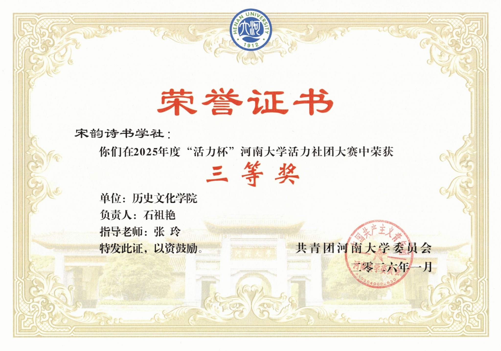 宋韵诗书学社凭借鲜明的文化特色,多样的活动形式与广泛的师生认可,荣获三等奖。学社始终秉持“传承经典,弘扬传统文化”的宗旨,为繁荣校园文化,促进学生德智体美劳全面发展贡献了社团力量。